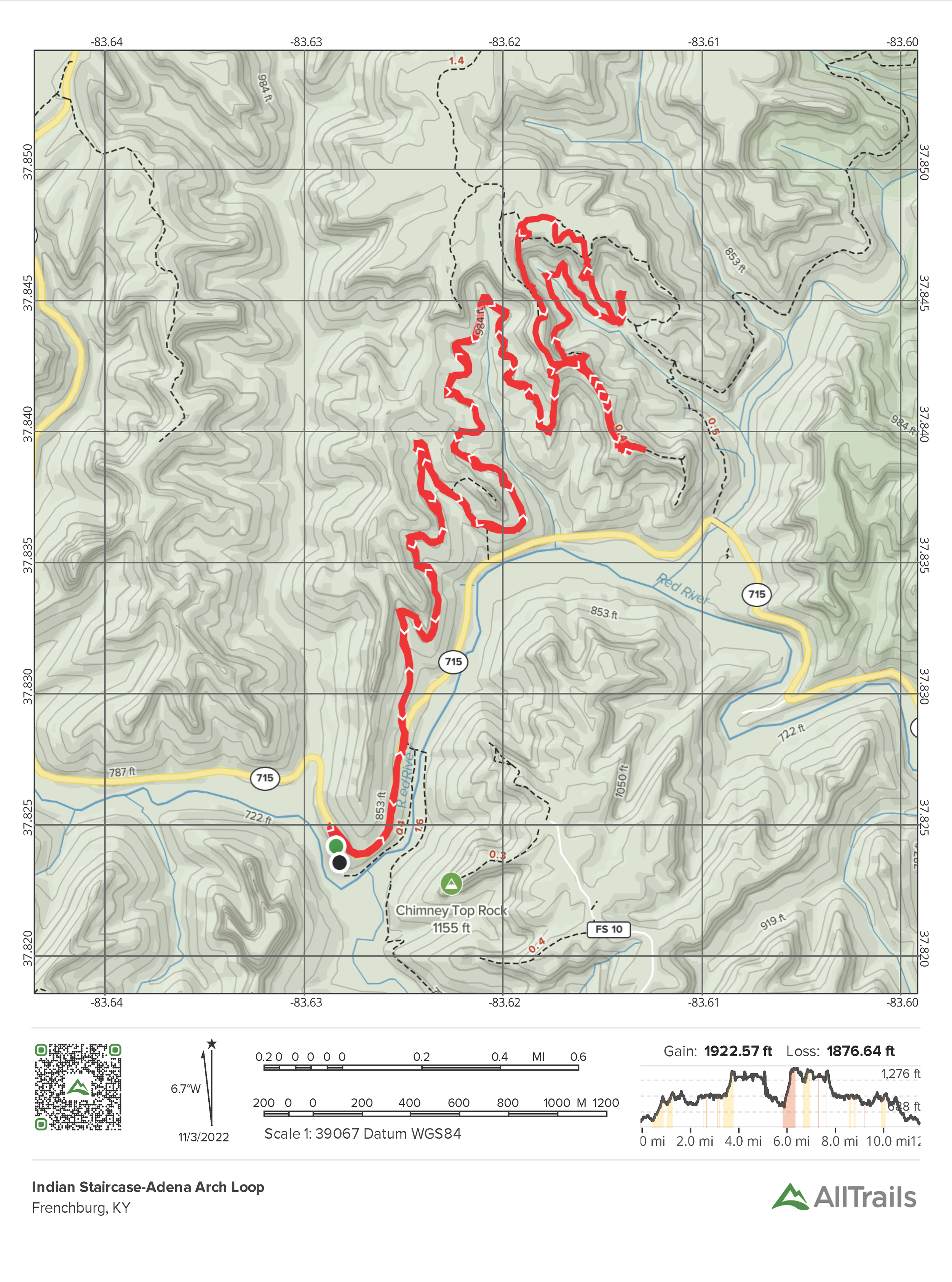 The trailhead is located off of KY 715 (Sky Bridge Road) at the end of a short gravel road that ends in a small parking lot. This is a popular trailhead as it is also the easiest access to Jump Rock (a local swimming hole). The hike begins by following the Red River for 0.4 miles until you reach the junction with the Sheltowee Trace Suspension Bridge. Turn left at the suspension bridge and cross KY 715 to continue on the trail.